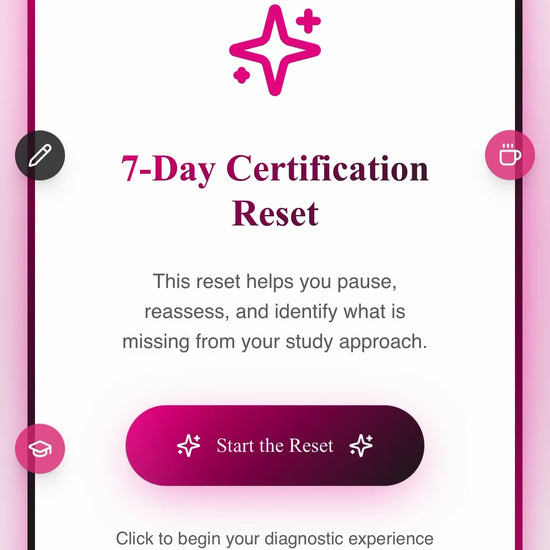 The 7-Day Certification Reset is a guided diagnostic experience for teachers who are studying for certification exams but feel stuck, overwhelmed, or unsure why their efforts are not paying off.