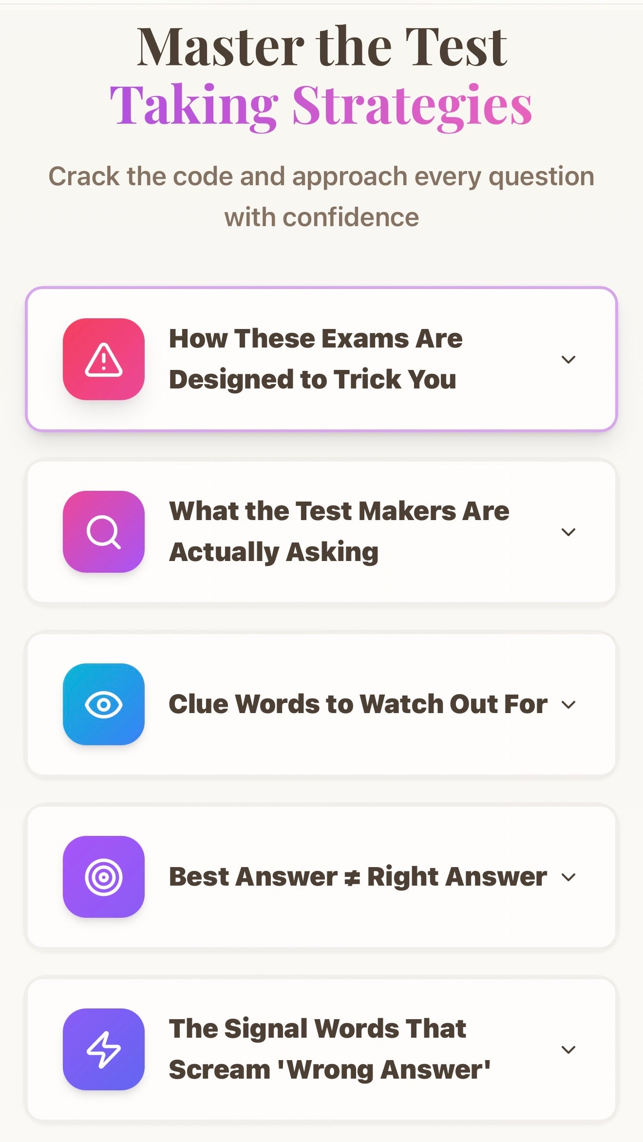 You will also learn how to apply the CCC Rule™, which stands for Clue, Concept, and Choice. This framework teaches you how to slow down and identify the most important detail in the question before jumping to an answer. You will learn how to pinpoint the true clue in the scenario, determine the underlying concept or skill being tested, and then choose the answer that most clearly aligns with that principle. Instead of picking what “sounds right,” you will follow a structured thinking process that removes guesswork and replaces it with clarity.